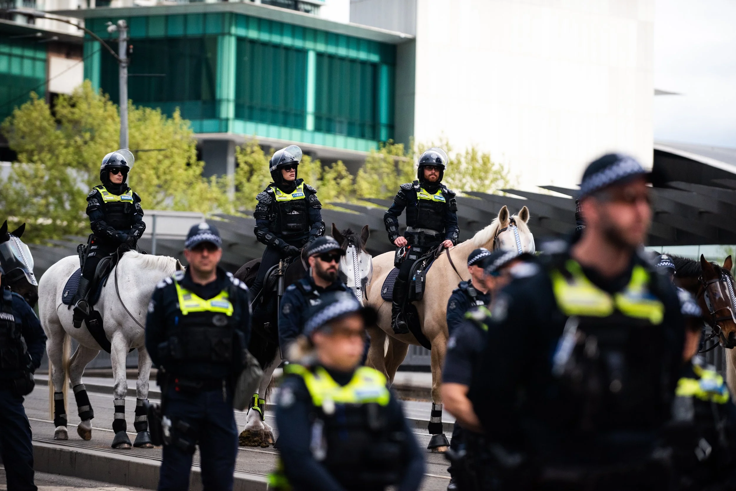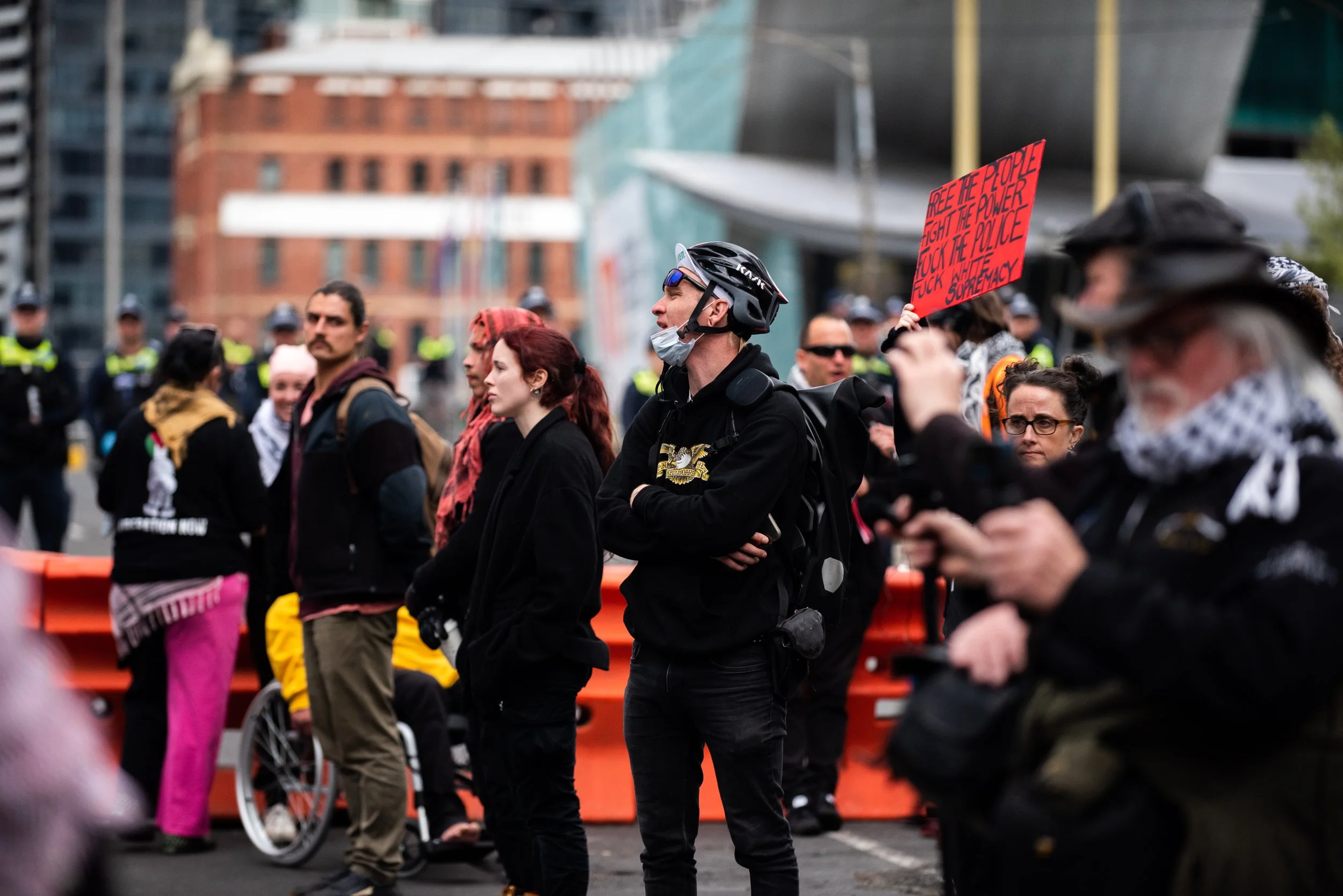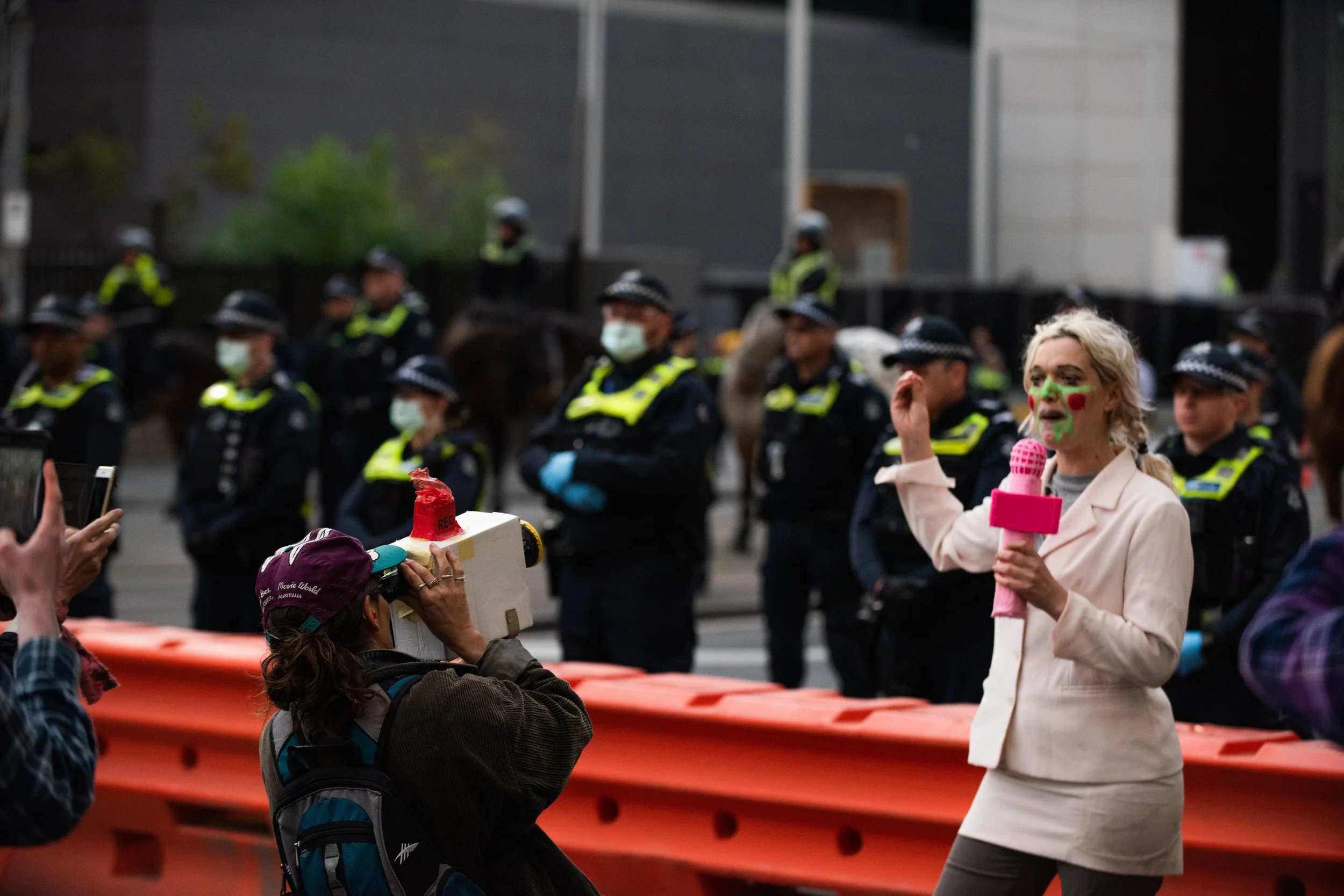 "An activist taken into custody by VicPol members as they enforce the "Designated Area Search Notice"