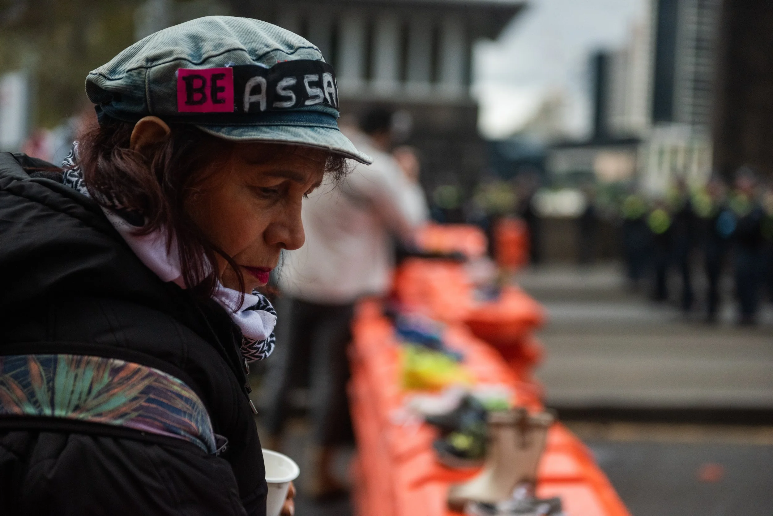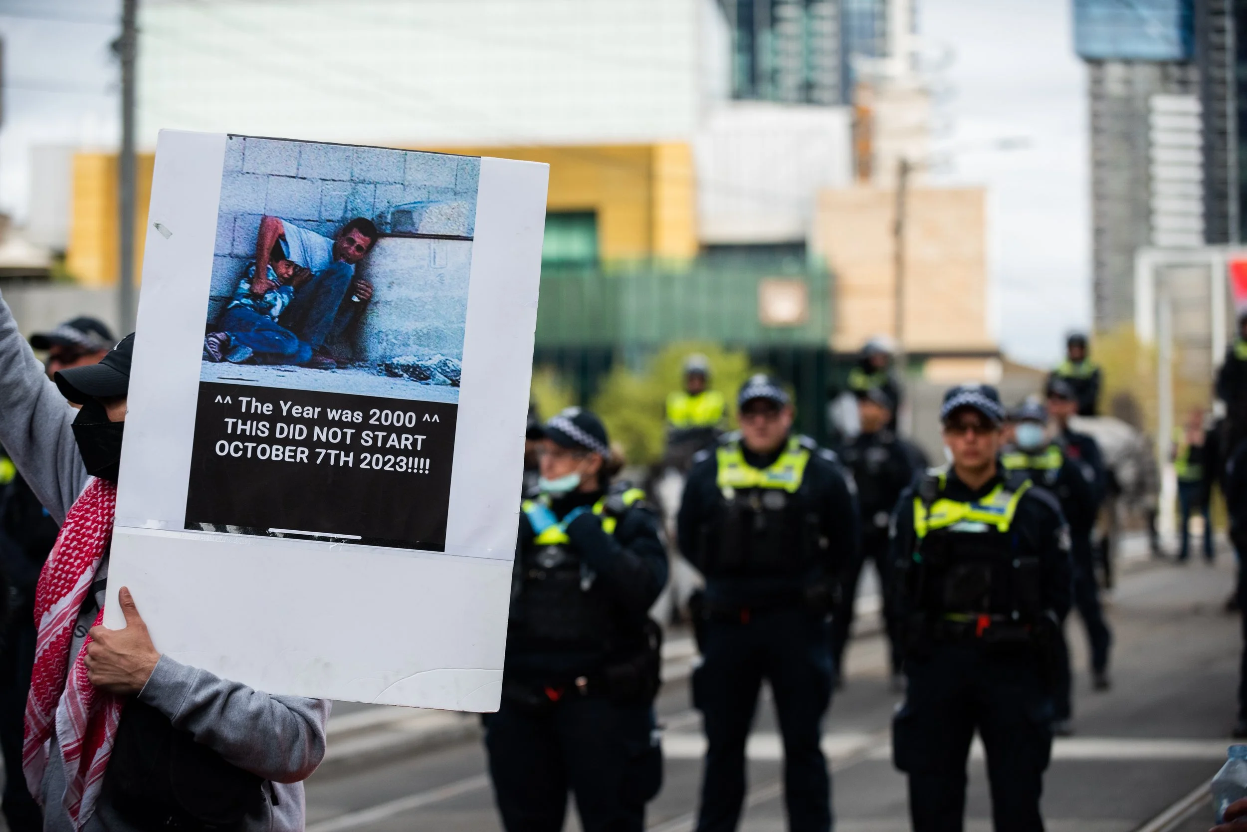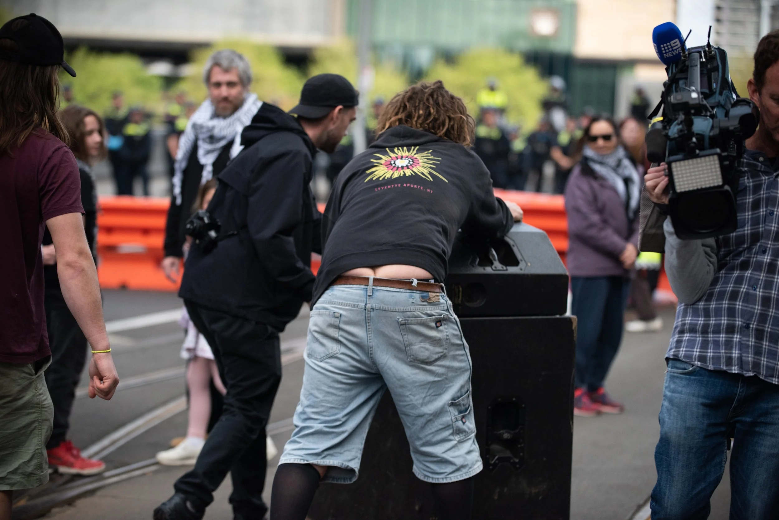 "An activist taken into custody by VicPol members as they enforce the "Designated Area Search Notice"