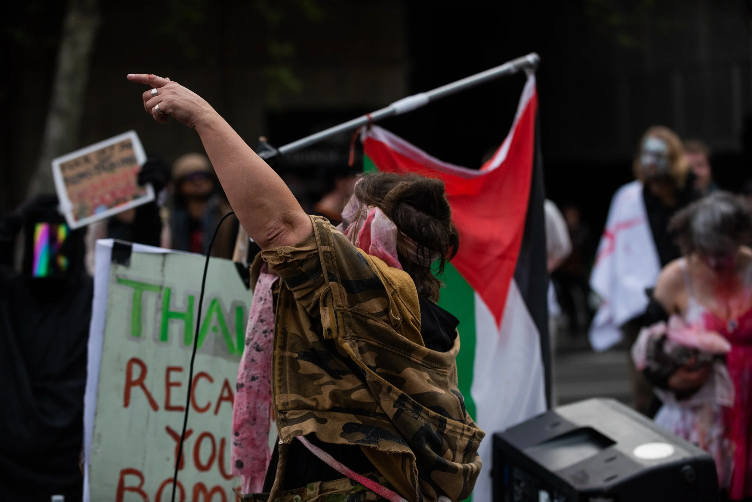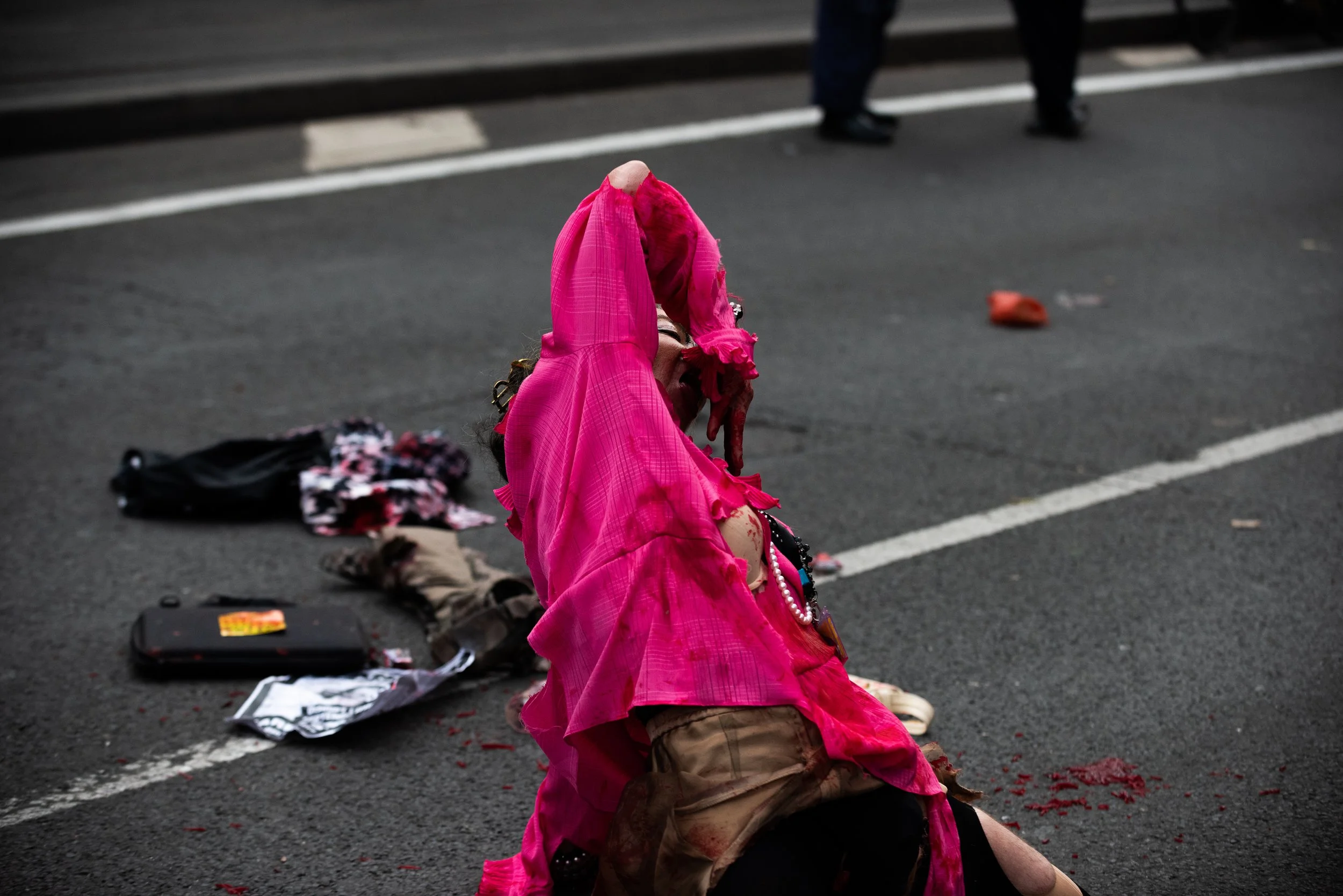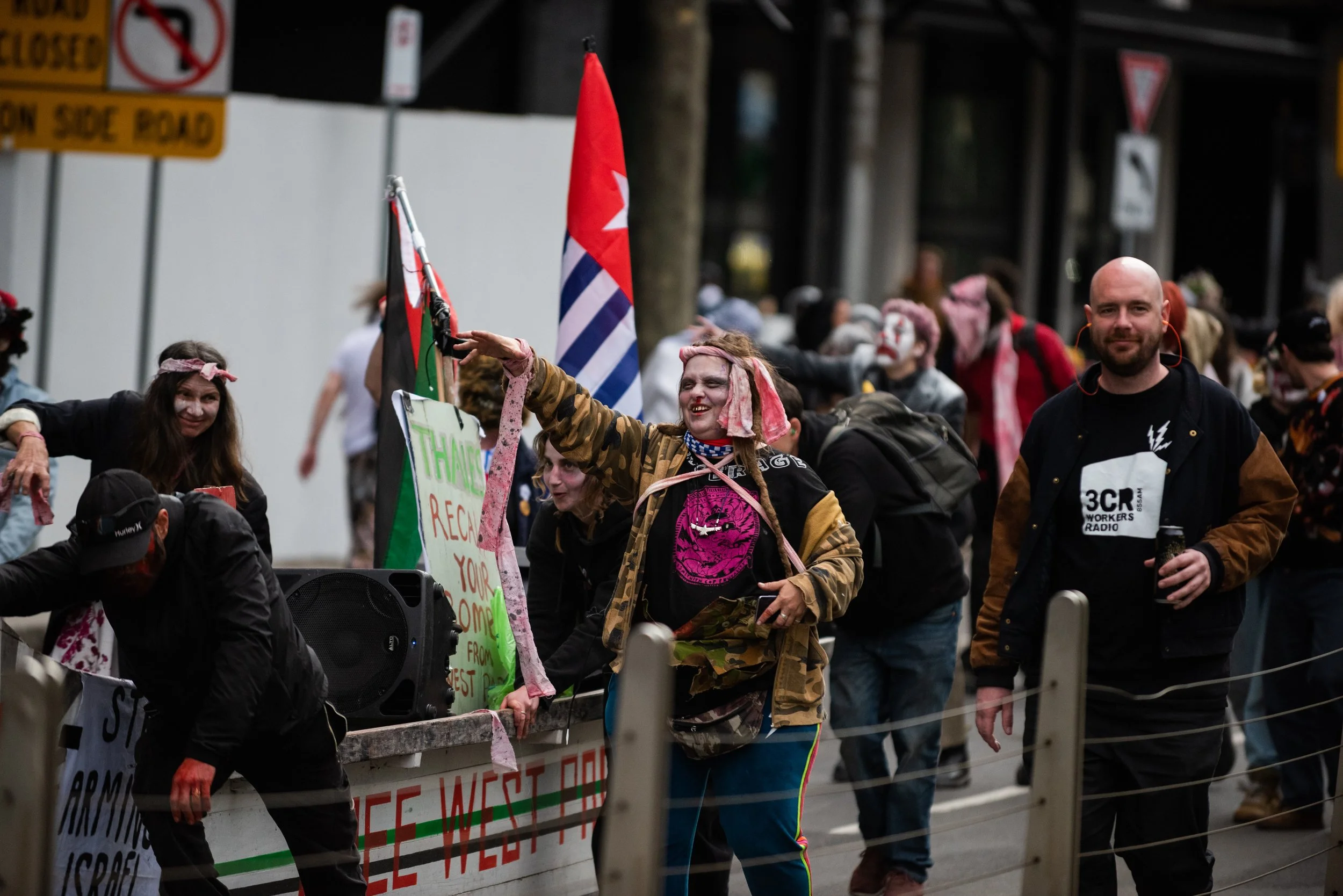 Scenes from Disrupt Land Forces on Friday where defiance danced through the streets in a zombie rave, uniting people to express their disdain for the giants of weapons manufacturing.